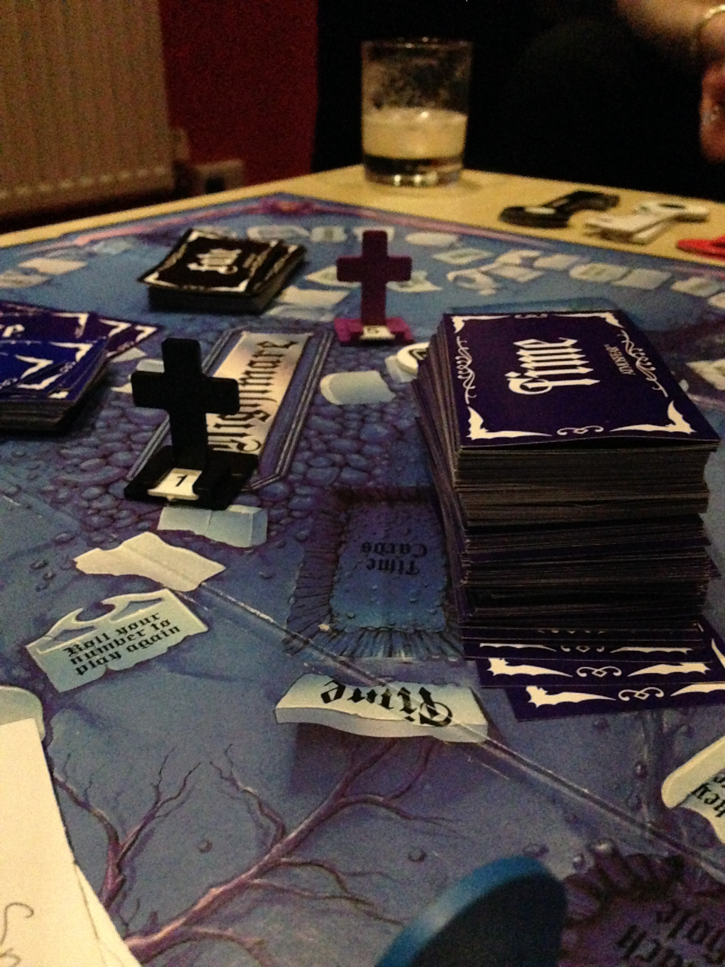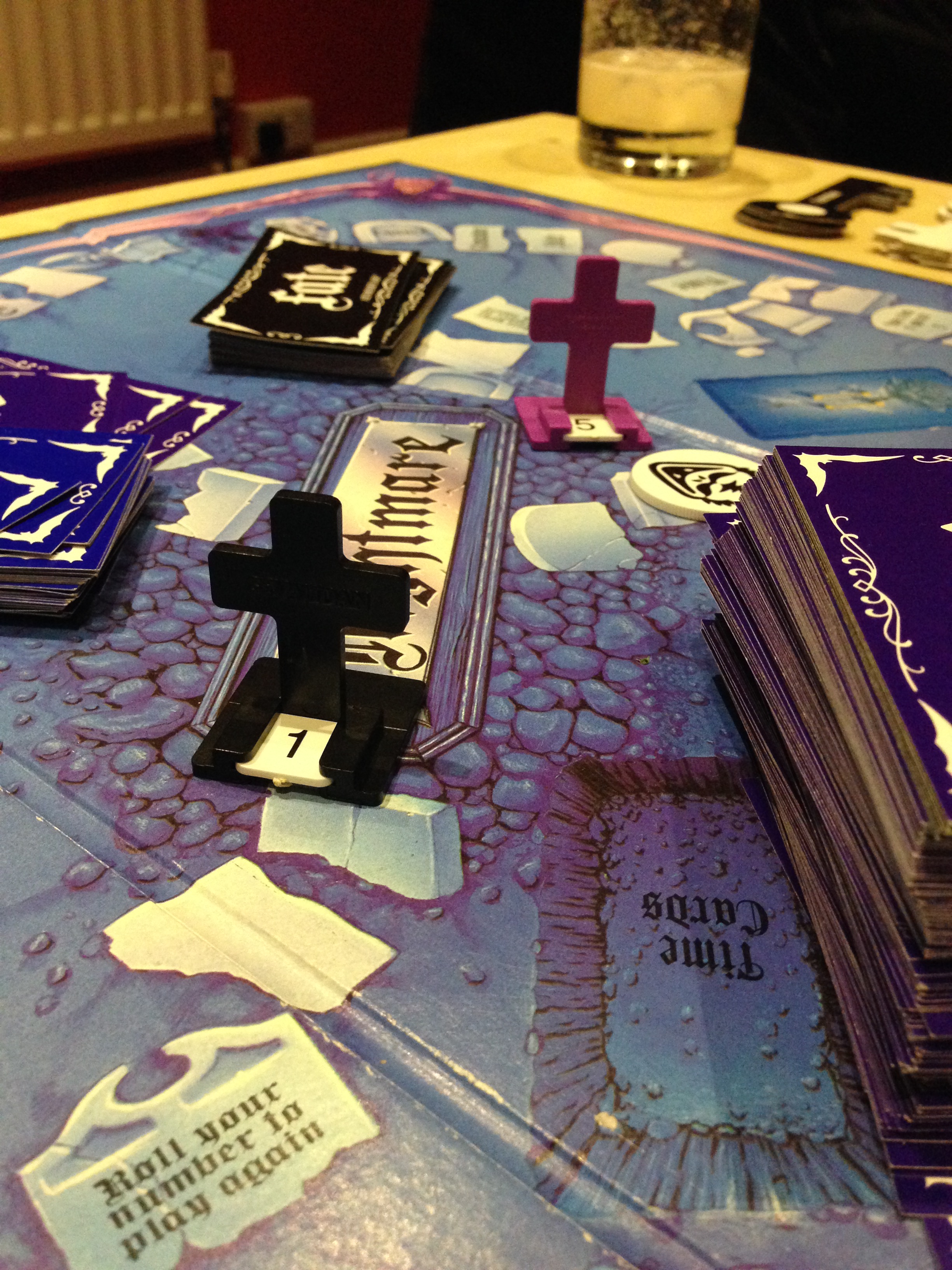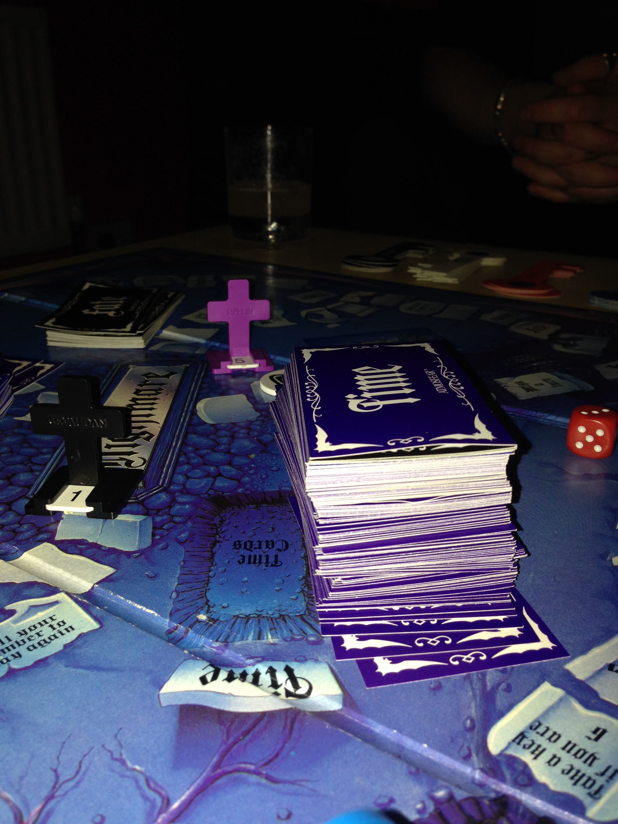 Other complicating factors are Fate cards and Chance cards, which seem to be more or less the same thing. Most of these are straightforward crap-game fare (roll the dice***, react to an outcome which may be favourable or unfavourable; hoard this very scenario-specific card until a specific scenario arises, at which point forget that you have this card; roll a 6 or miss a turn, etc), while others are frankly weird. Bob got royally stitched by a card which asked that a player choose another player and, whenever that player made a decision, rub their hands together while looking all sly and questioning their decisions. When they inevitably ask ‘why are you acting like a villain from Scooby-Doo?’ you can steal all their hoarded Fate and Chance cards.