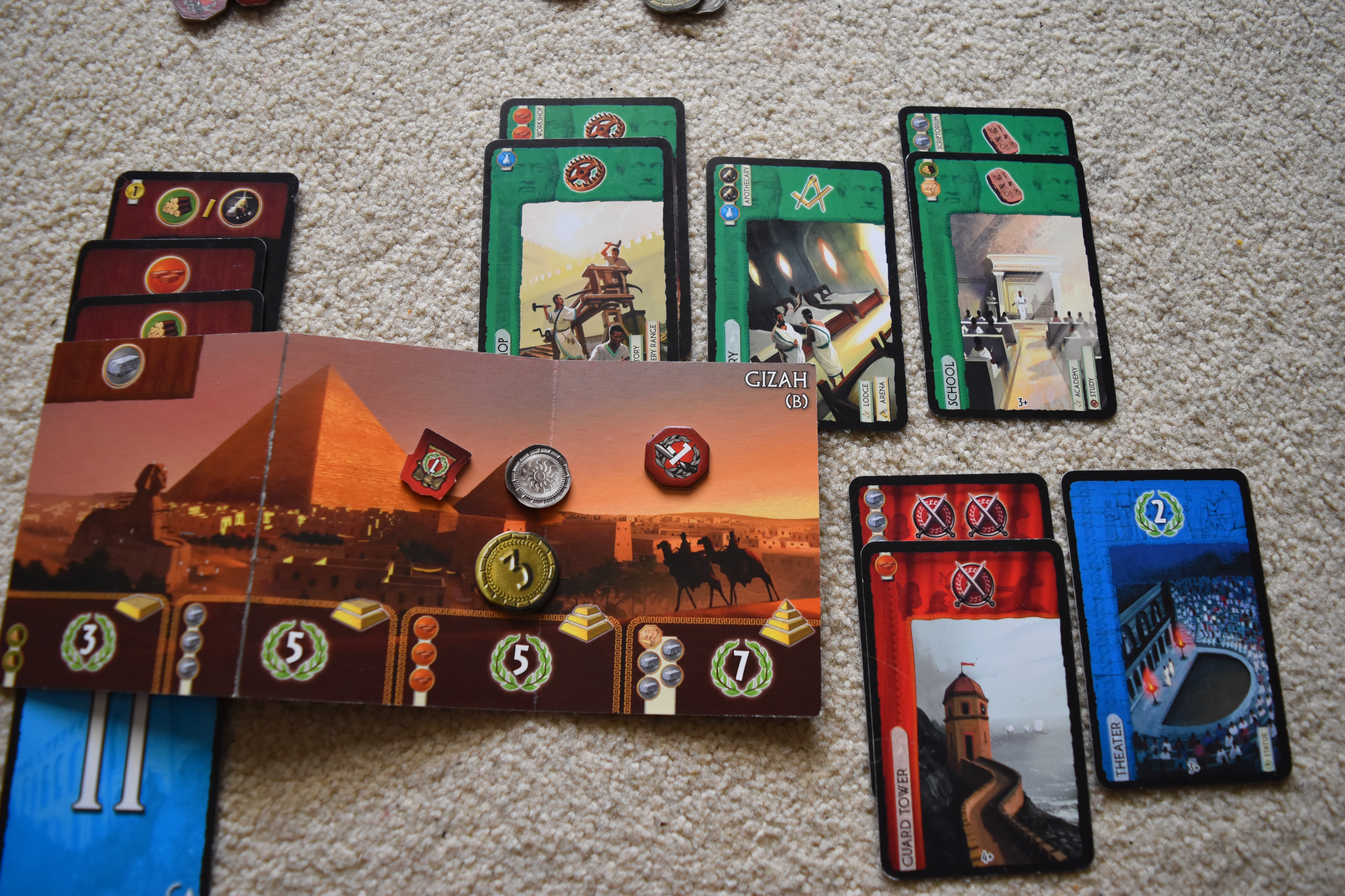To begin, each player is assigned a great world wonder. One of seven, hence the name, but you probably figured that bit out (It’s not doing the “Five Tribes” trick where there aren’t actually five players and you don’t actually get to play the five tribes, confusingly.) Again, if you’ve played Civilization (the non-board-game version) you’ll already recognise the wonders; maybe you might even recognise them anyway. They differ both in starting resources and the benefits they offer. During the game you can, but are by no means obligated to, build parts of your wonder (they usually have 3 stages), and thus reap some tasty ancient treats.