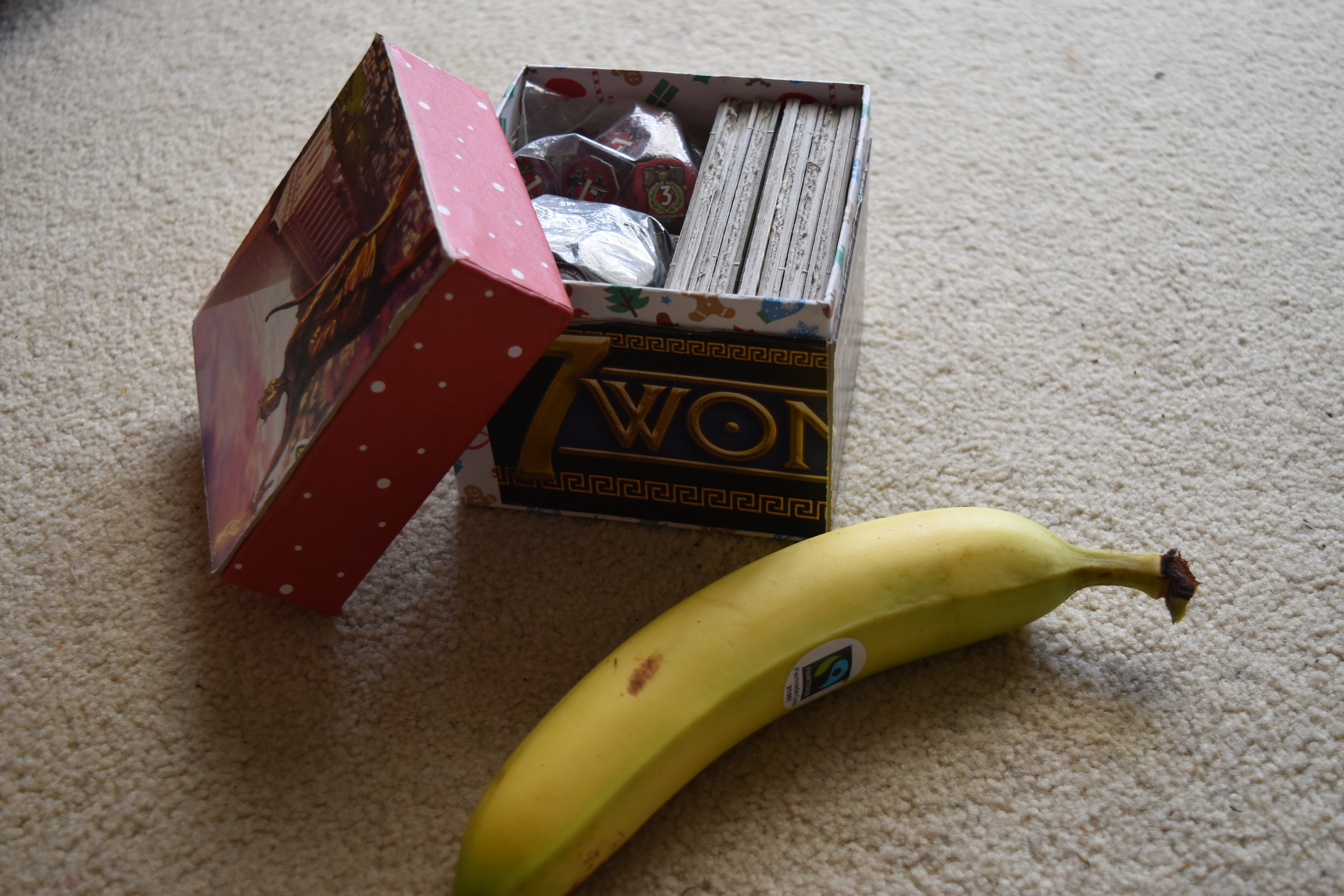 In Briony’s house, the copy of 7 Wonders was deemed too big to carry around with ease. To address this her angry spiky-haired boyfriend Pat spent a week engineering the perfect compact version, presented in a lovely Christmas gift box. The juxtaposition of the Colossus of Rhodes and the Christmas tree works beautifully. To give you some indication of exactly how much more compact it is, here is a fair trade banana for scale.
