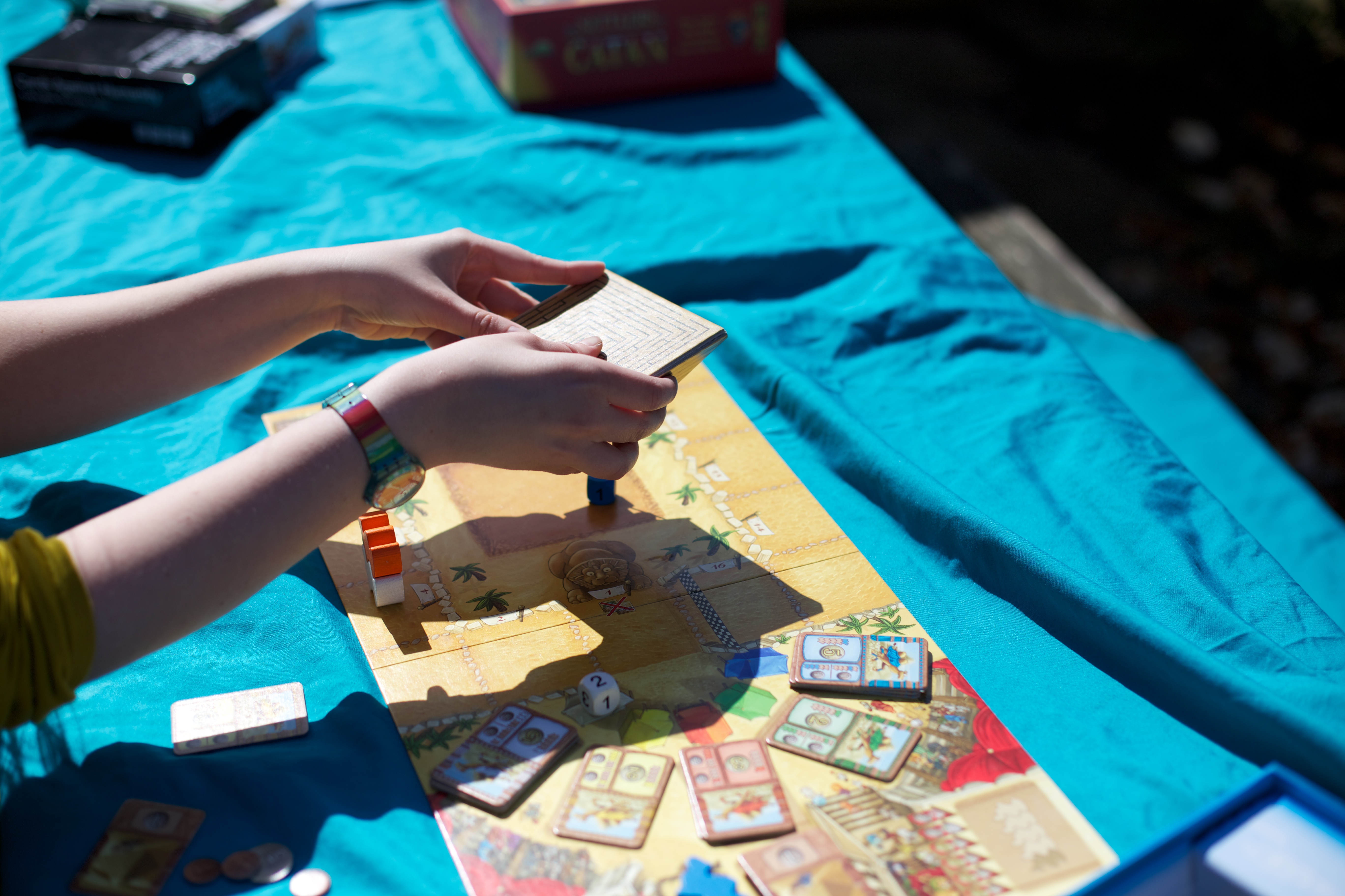 Yep. Apparently the race course is so narrow that there ain’t no room for camels to be side-by-side. When a camel trundles onto an already-occupied tile, they’ll just park their camelly behind on top of that first camel. This is a mechanism that makes Briony feel deeply uncomfortable – when she’s claimed a certain spot on the board she expects not to share, or at least to swear at someone attempting to come near her. This is a particular problem in other games like Tigris and Euphrates as she strongly believes in keeping other civilizations out. Everyone else though? In awe.