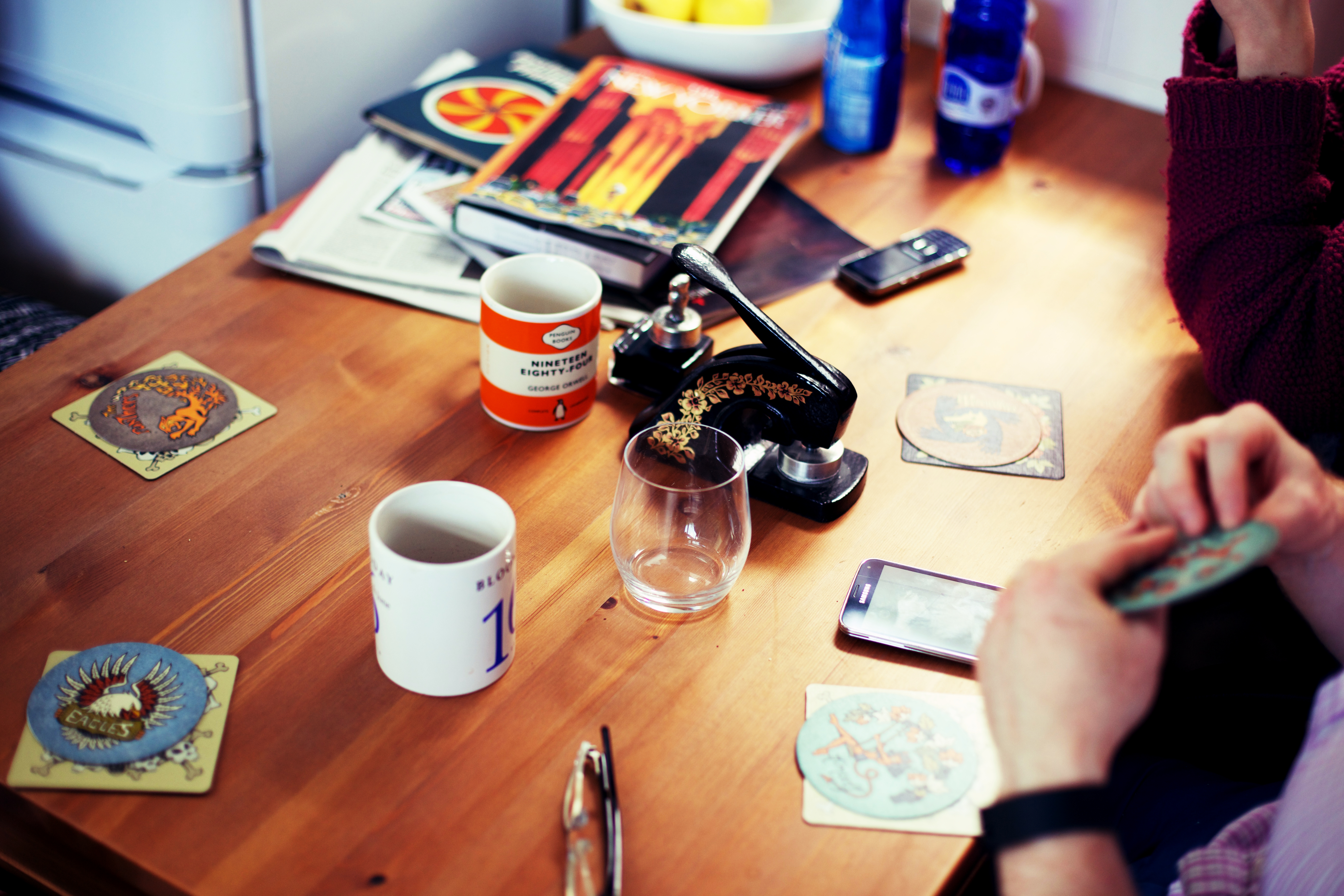 It’s a short game, and it’s a game of bluff. Everyone takes turn placing cards down in front of them (insignia side up, or the bluff part won’t be very effective) and definitely remembering whether you’ve put down a rose or a skull. Eventually one person will decide that instead of putting down a new card they’ll ‘bid’ on how many circular beer mats they can turn over without finding a skull. The trick is, whoever wins the bid (and therefore actually has to attempt to do so) will have to start with their own beer mats first, and starting from the top. Getting it right will lead you halfway to victory (counted by flipping over your square beer mat) and the penalty for getting it wrong is a good mocking and removal of one of your four cards, making it more difficult for you to play. (Particularly if you lost four times… having no cards makes it very difficult to play indeed)